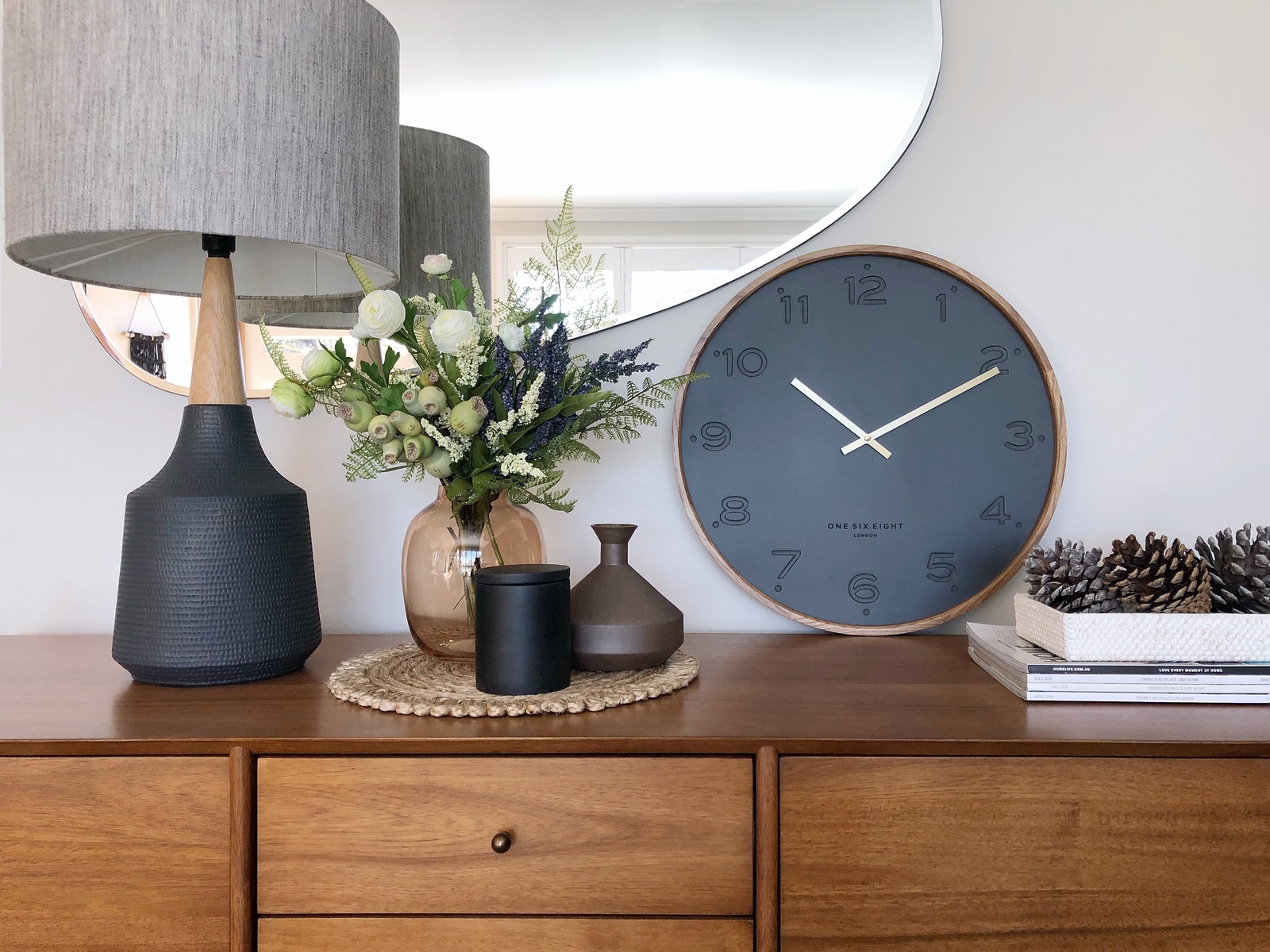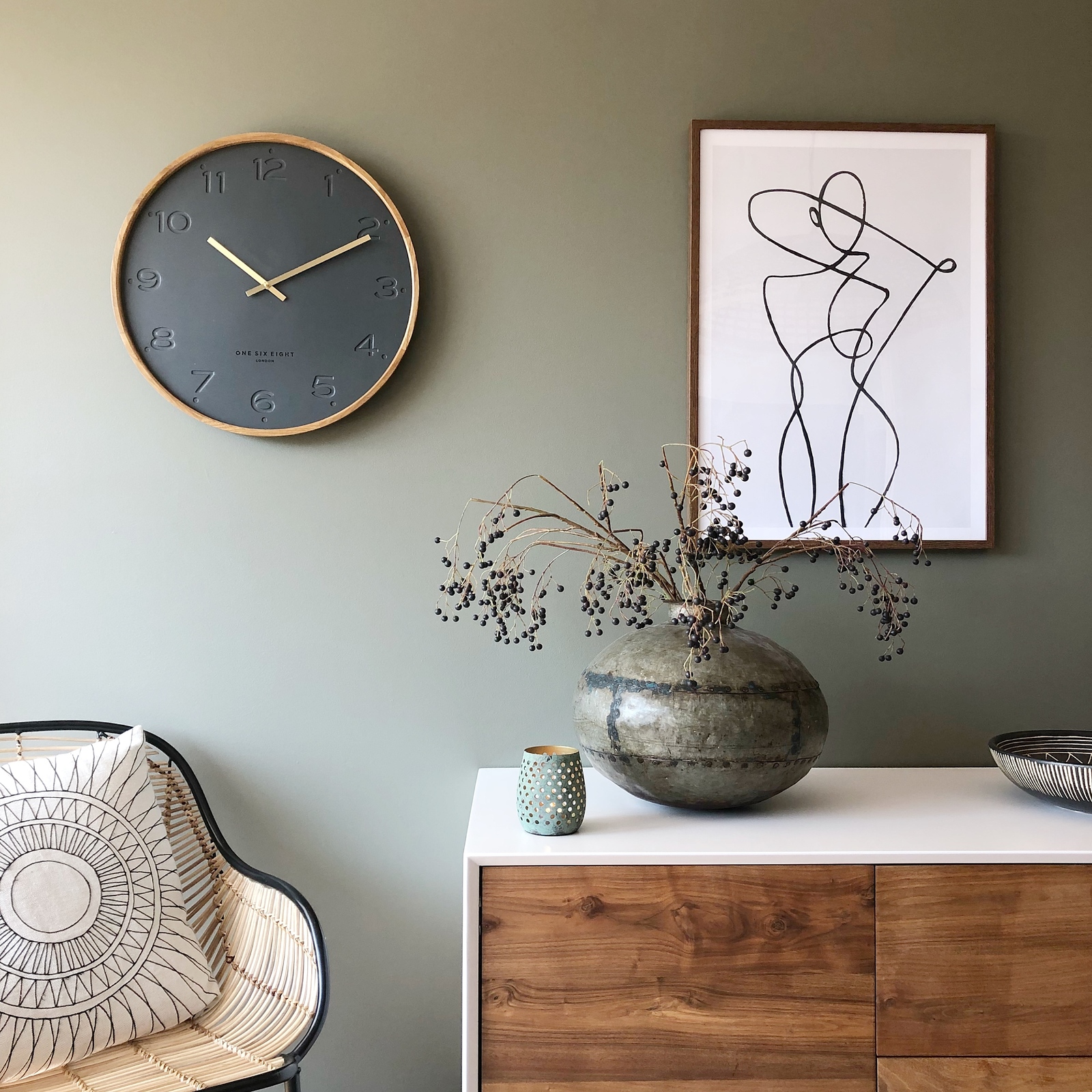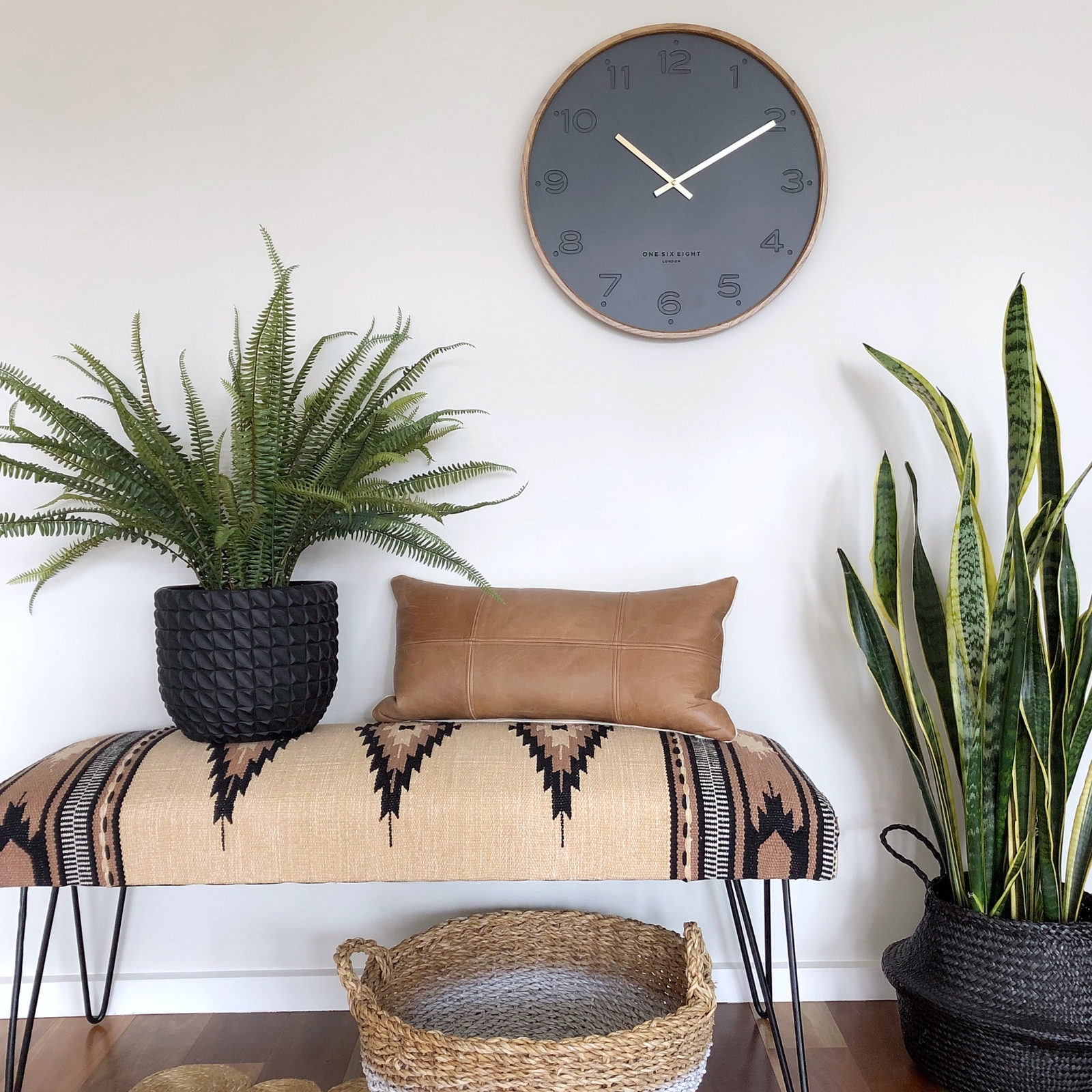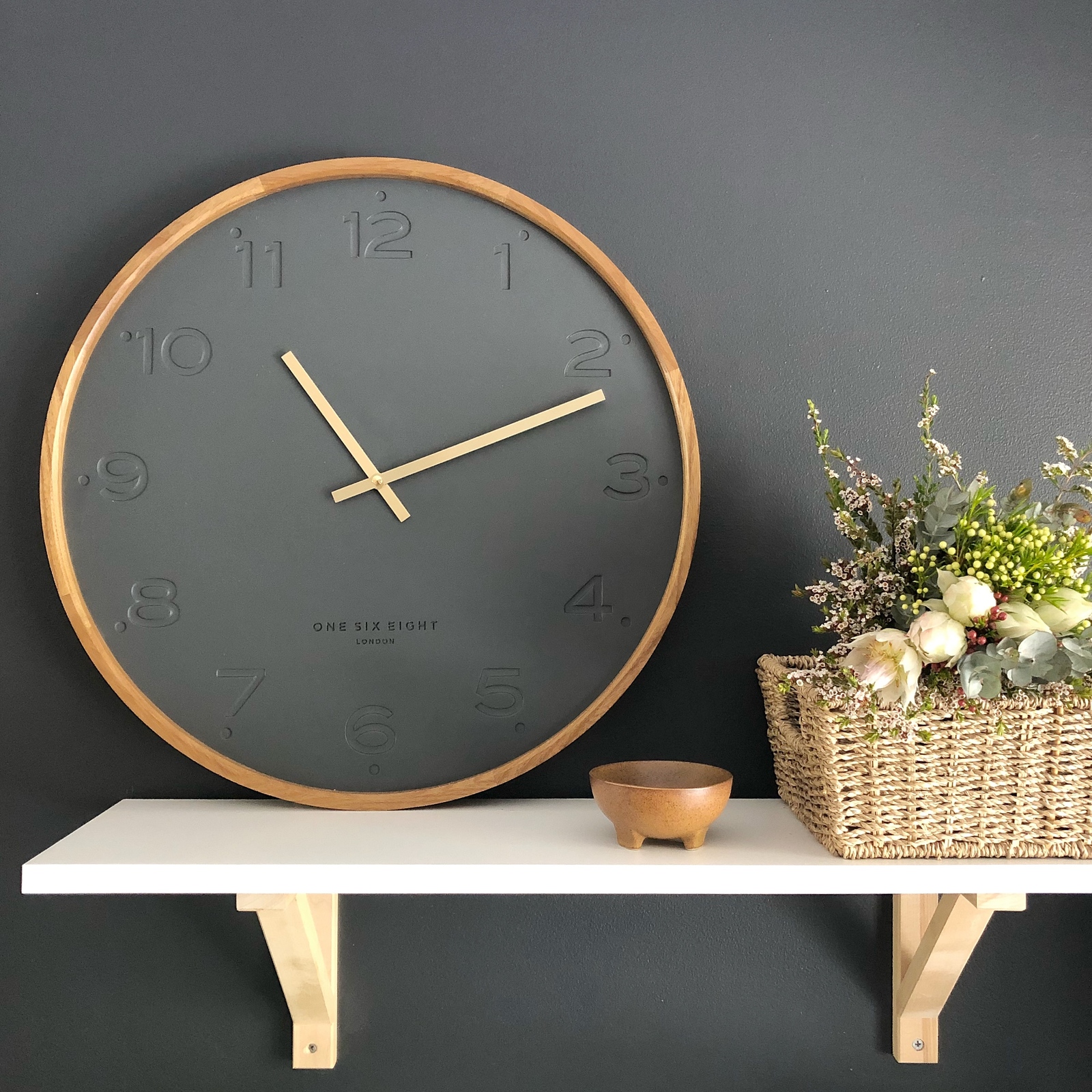 Shop online at One Six Eight LondonThe Freya wall clock by One Six Eight London boasts a simple face that creates a sleek, stylish backdrop for stamped Arabic numbers and polished hands. Clean, contemporary design meets traditional rustic materials, with an uncluttered dial surrounded by a tactile wood frame. The look is neat and dappe with an ultra-modern edge. It's an unobtrusive design that sneakily catches the eye through clever use of detail. This is the ideal accessory for a home study, kitchen, living room or office decorated in the ever-popular Scandi style.