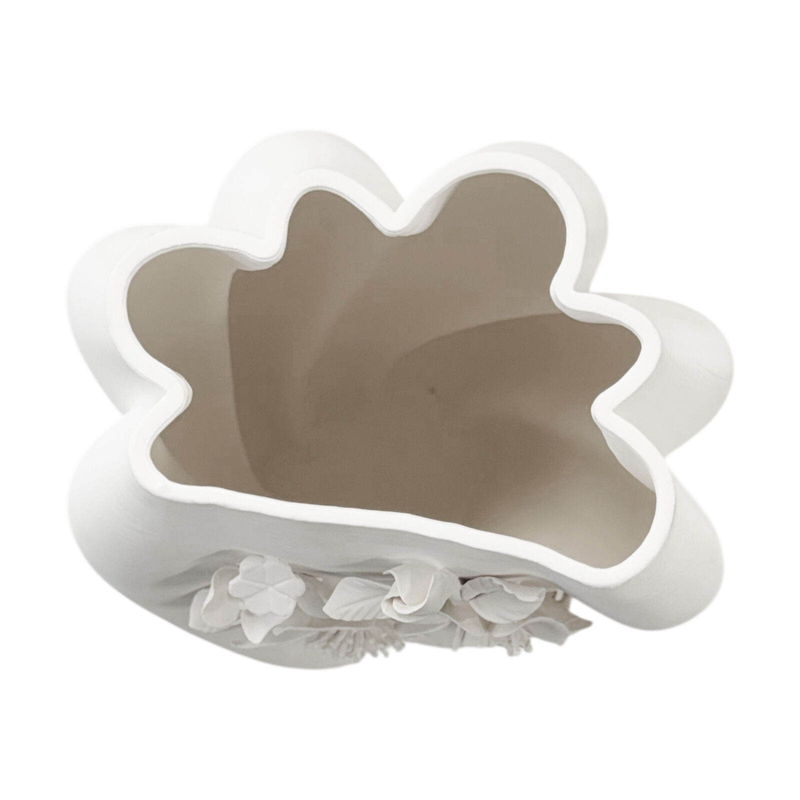 A sculptural matte vase featuring delicate, hand-crafted floral detailing — combining modern 3D-printed design with artisanal finishing for a truly unique statement piece.