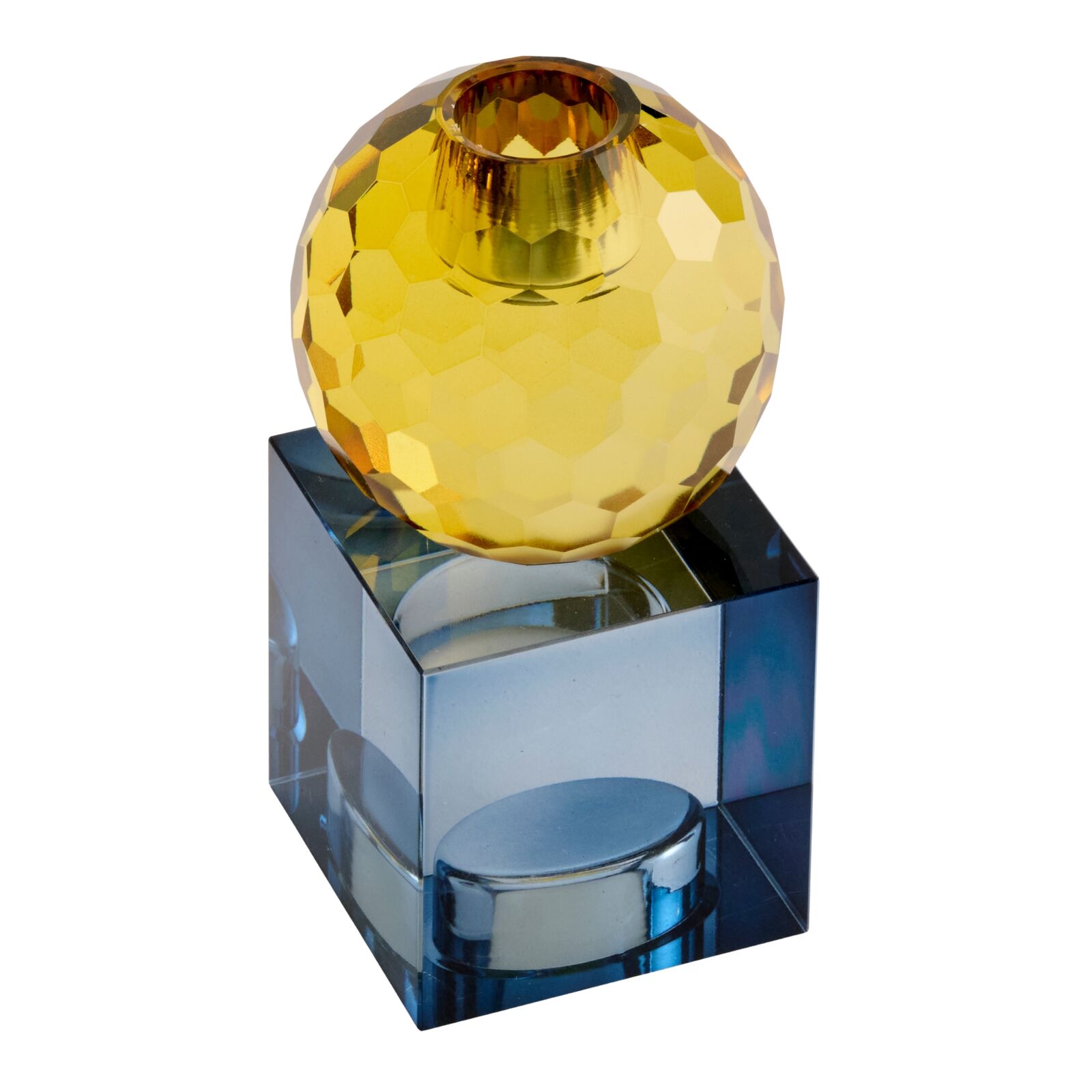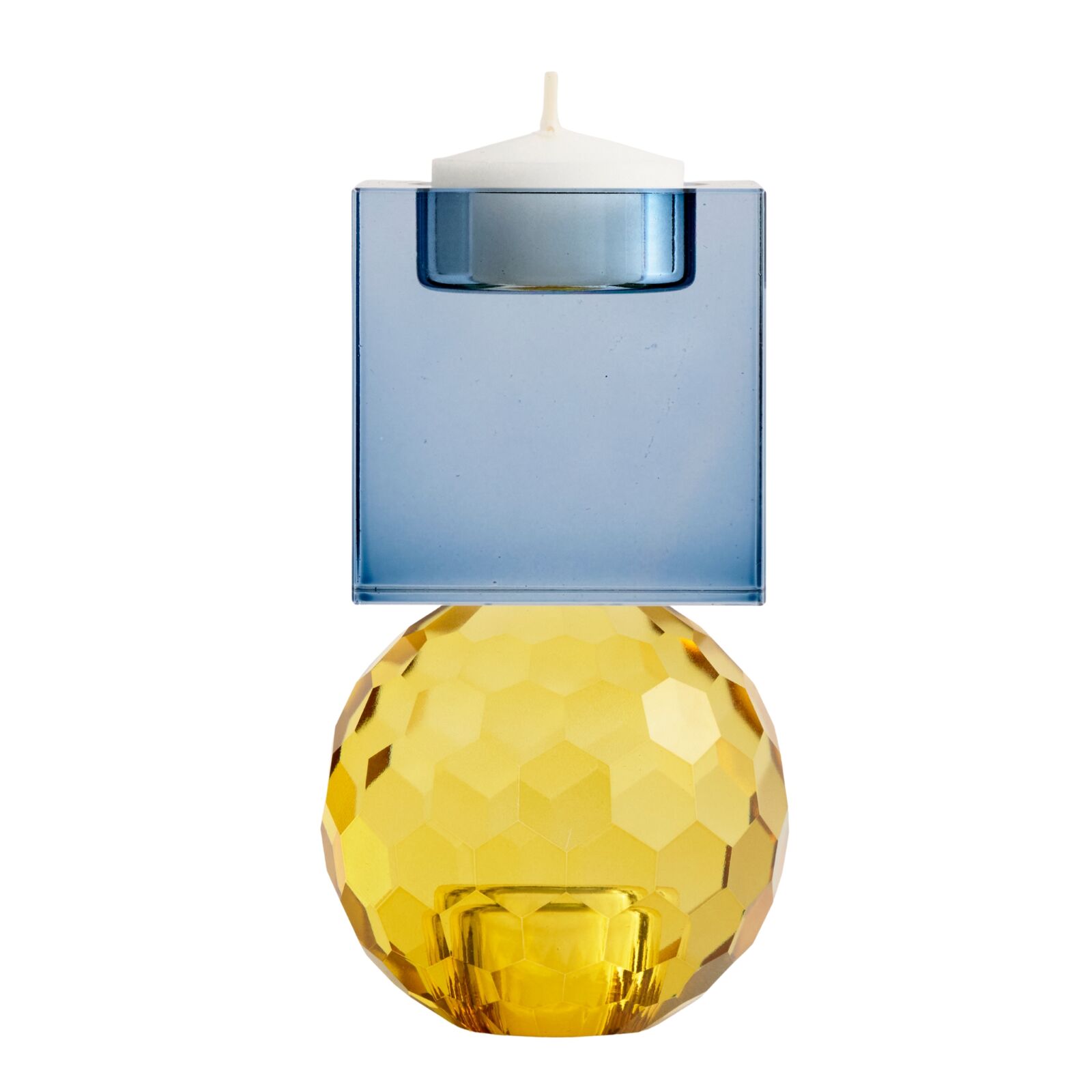 Elevate your decor with the sculptural elegance of the Reign Blue Candle Holder by One Six Eight London. This striking 12cm design features a faceted golden sphere (Pantone 3599 C) set atop a deep steel blue glass cube (Pantone 2374 C), creating a beautiful balance of warm and cool tones.